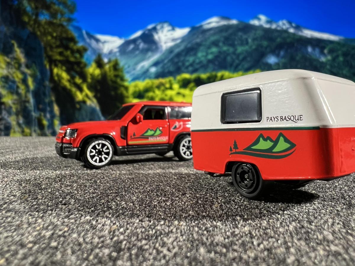 Pays Basque: Land Rover Defender 90 mit ERIBA Puck Wohnwagen